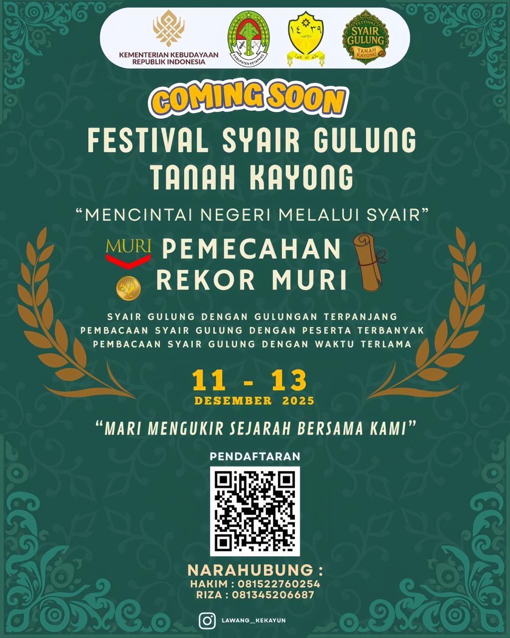 Ikuti Festival Syair Gulung Tanah Kayong dan jadilah saksi/peserta dalam Pemecahan Rekor MURI. Tunjukkan kecintaanmu pada negeri melalui syair! 11-13 Desember 2025. Segera daftarkan diri dan bantu sebar luaskan kepada semua warga ketapang dan sekitarnya